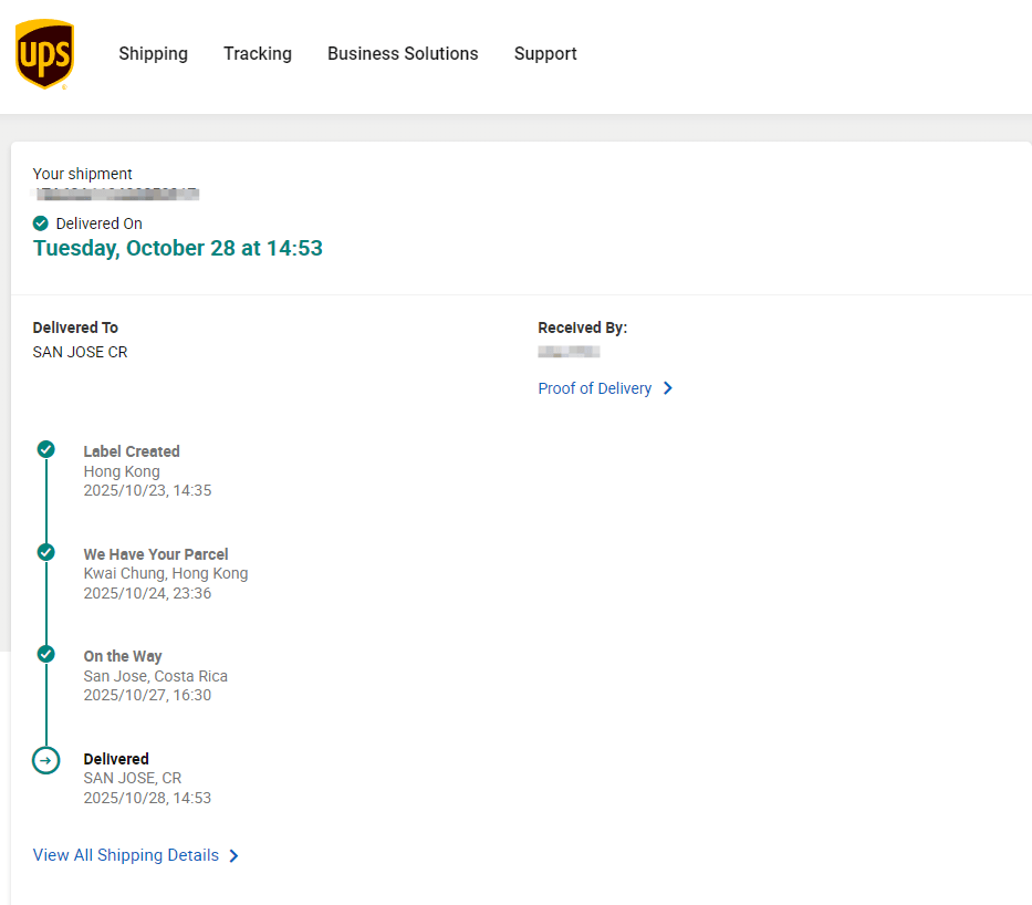 Here share the tracking information to Costa Rica order shipment. They are our repeat order customer from Costa Rica that already lasts for 5 years. This time the products they ordered is not our featured producs, however, we still helped with them with the sourcing and shipment, UPS already delivered.